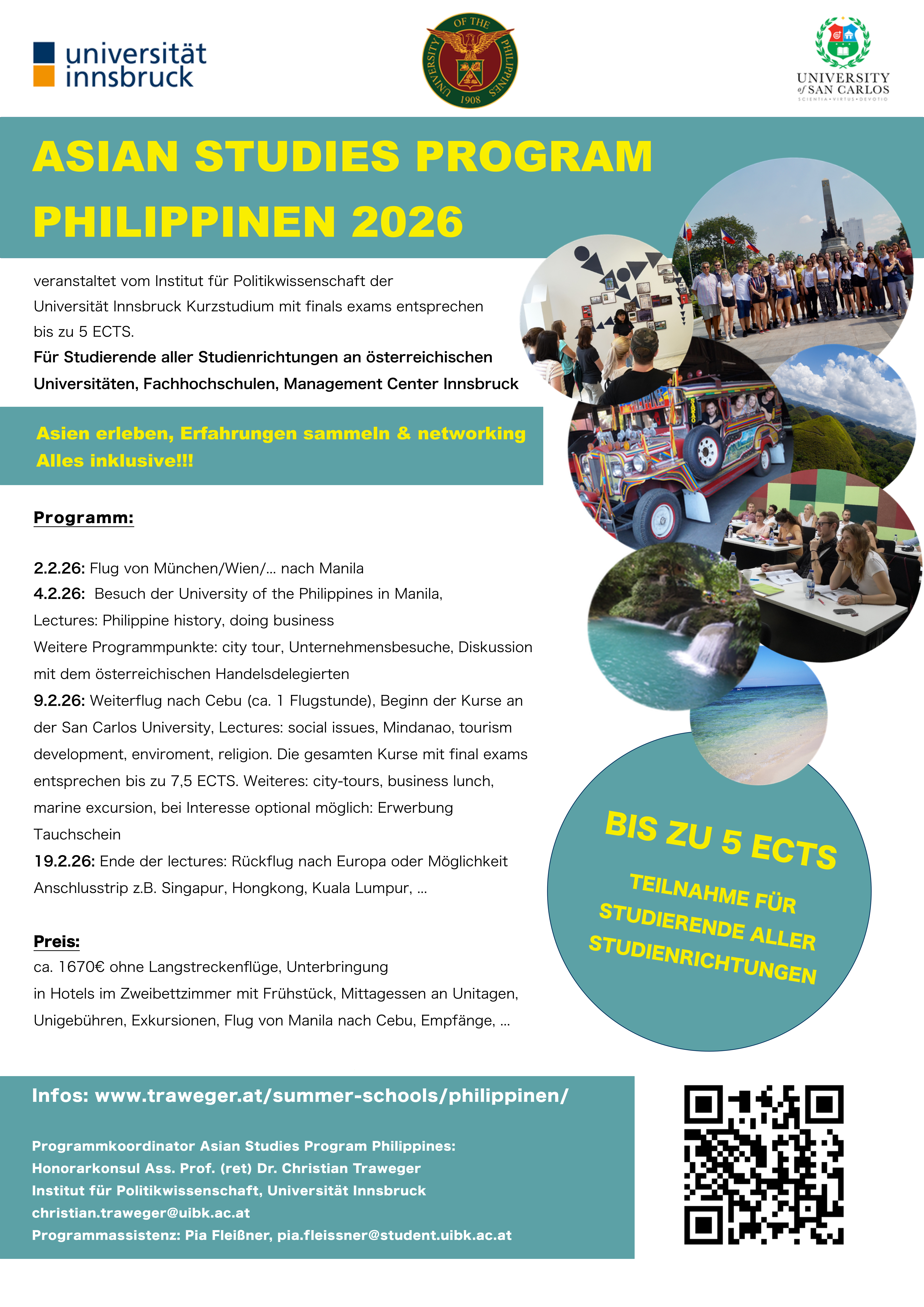 Im Februar 2026 wird wieder das Asian Studies Program auf den Philippinen organisiert. Das Programm steht Studierenden aller Studienrichtungen an österreichischen Universitäten, Fachhochschulen und dem Management Center Innsbruck offen.